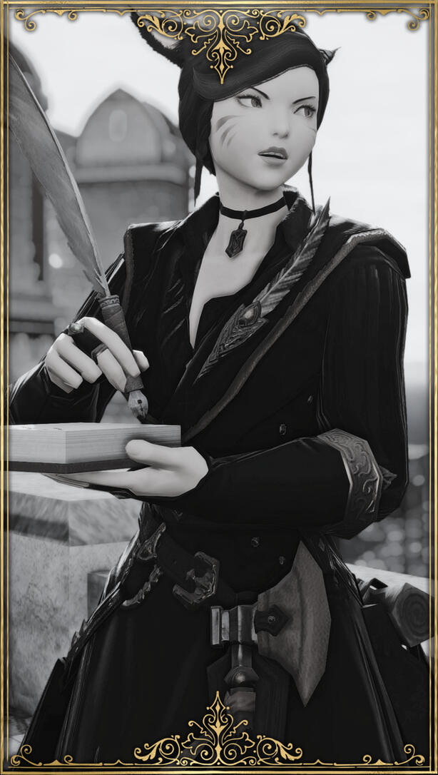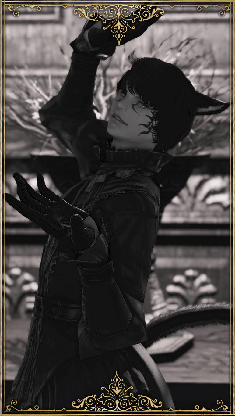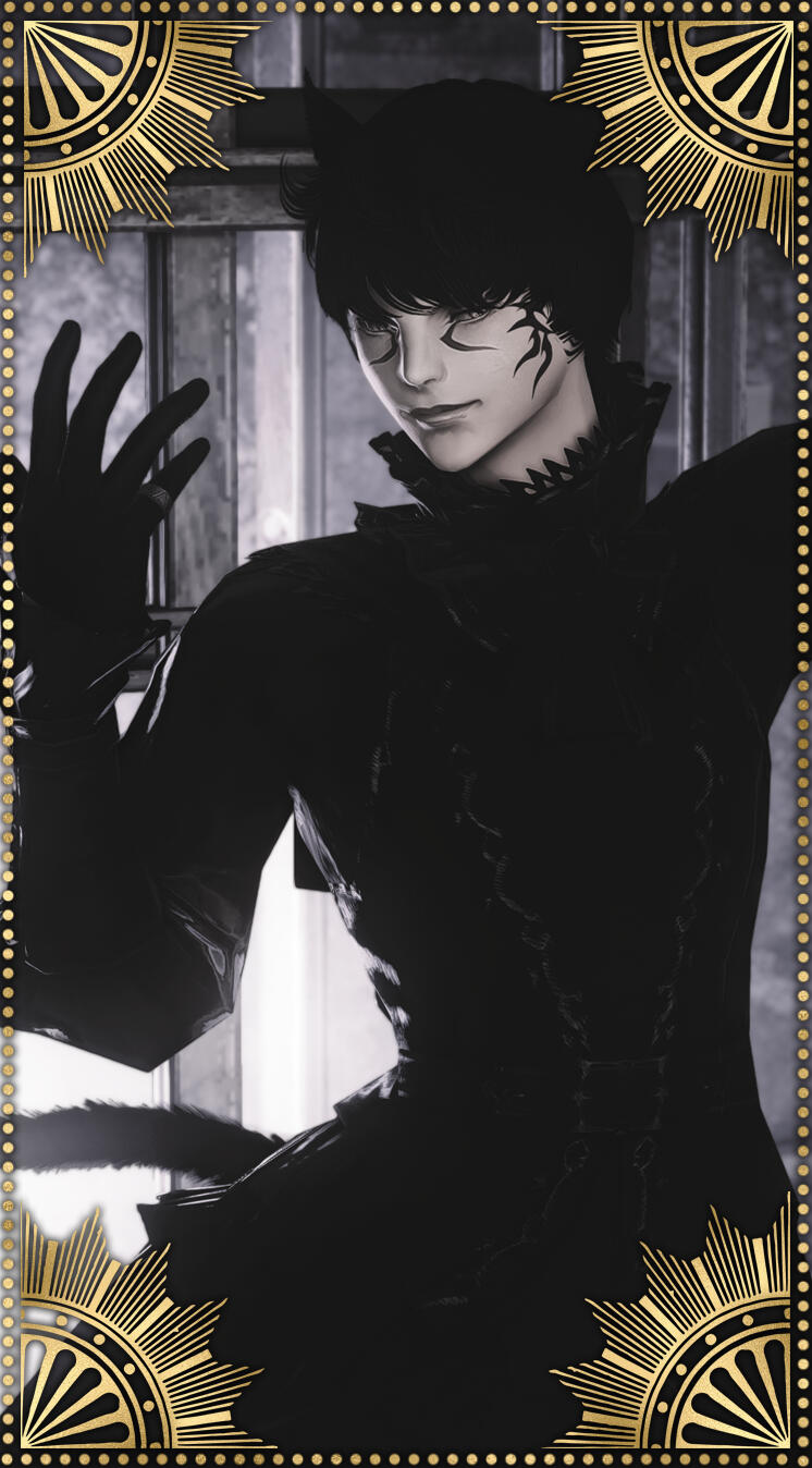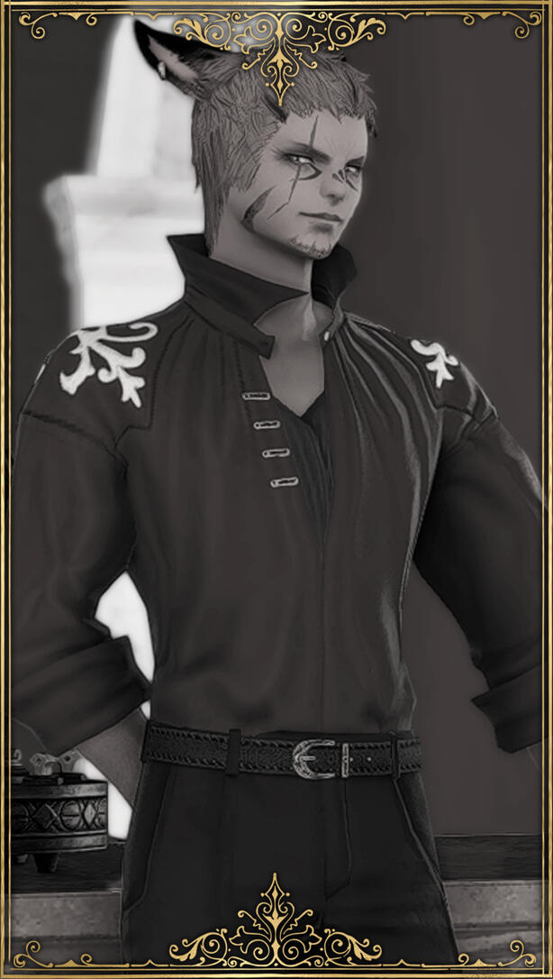 After an unpleasant encounter with one of his father's business associates, a young E'lithas awakened abruptly at three bells past the twelfth that same night. Sitting up in bed, he looked out his window and caught movement at the edge of the estate property, close to the treeline. Curious, he ventured outside (none were awake to notice, nor would they have cared if they were) and crossed the well-kept lawn. Upon reaching the edge of the property, he entered the cedarwoods and was offered freedom.A deal was struck, a book signed, and a price promised to be collected at a later time — when it 'twould be delicious.Until then, E'lithas continued his tutoring, far more focused on putting his knowledge of card games to use. Now old enough to navigate the roads to Limsa Lominsa on his own, he made it a habit of regularly traveling into the main city-state, where he began to indulge in what would become one of his greatest vices: gambling. Over the next few summers, he established a reputation in the guild halls, taverns, and Limsan docks as a striking miqo’te lad with the wits about him to clean out an entire crew’s coin purses.